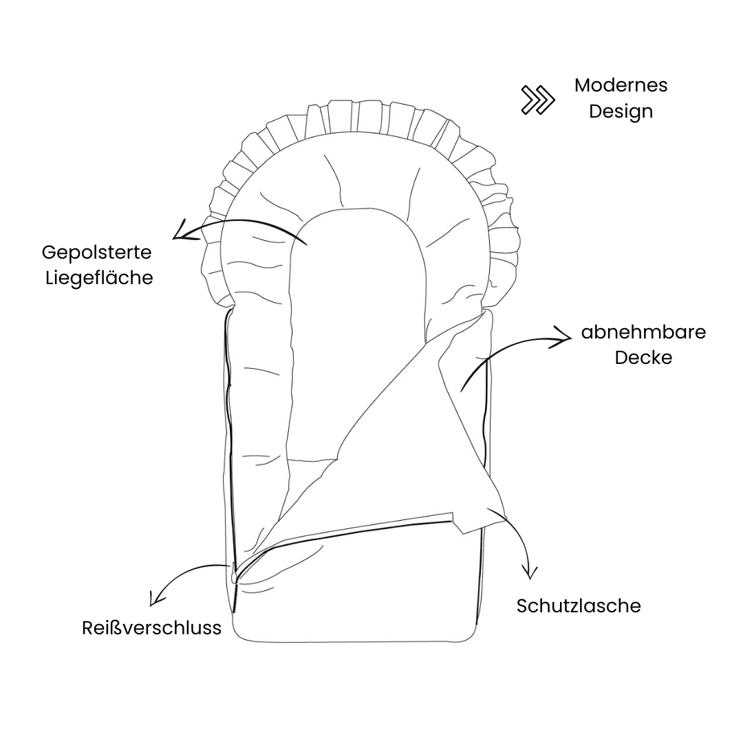 Dank der beidseitigen Reißverschlüsse ist das Hineinlegen & Herausnehmen besonders einfach. Die abnehmbare obere Decke bietet zusätzliche Flexibilität: Sie kann separat als Matratzenpolsterung genutzt oder durch eine andere passende Decke ersetzt werden.