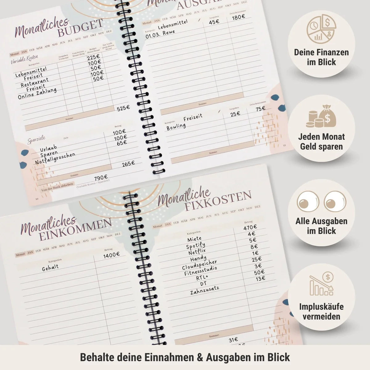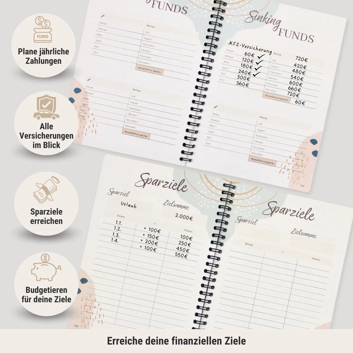 - Inhalt: Enthält Sinking Funds, Sparziele, Geschenke, Ausgaben pro Woche, Notizblätter und vieles mehr.