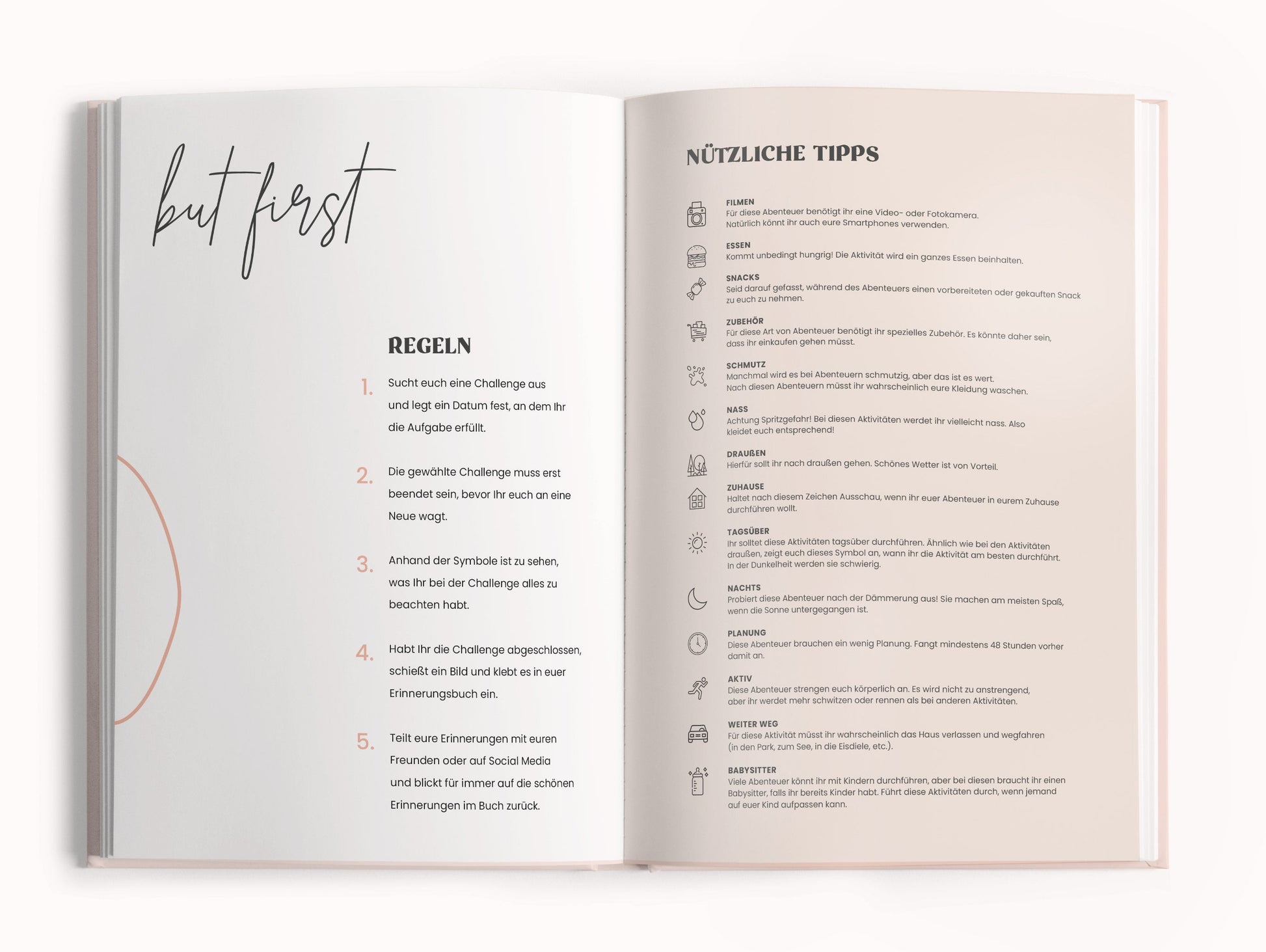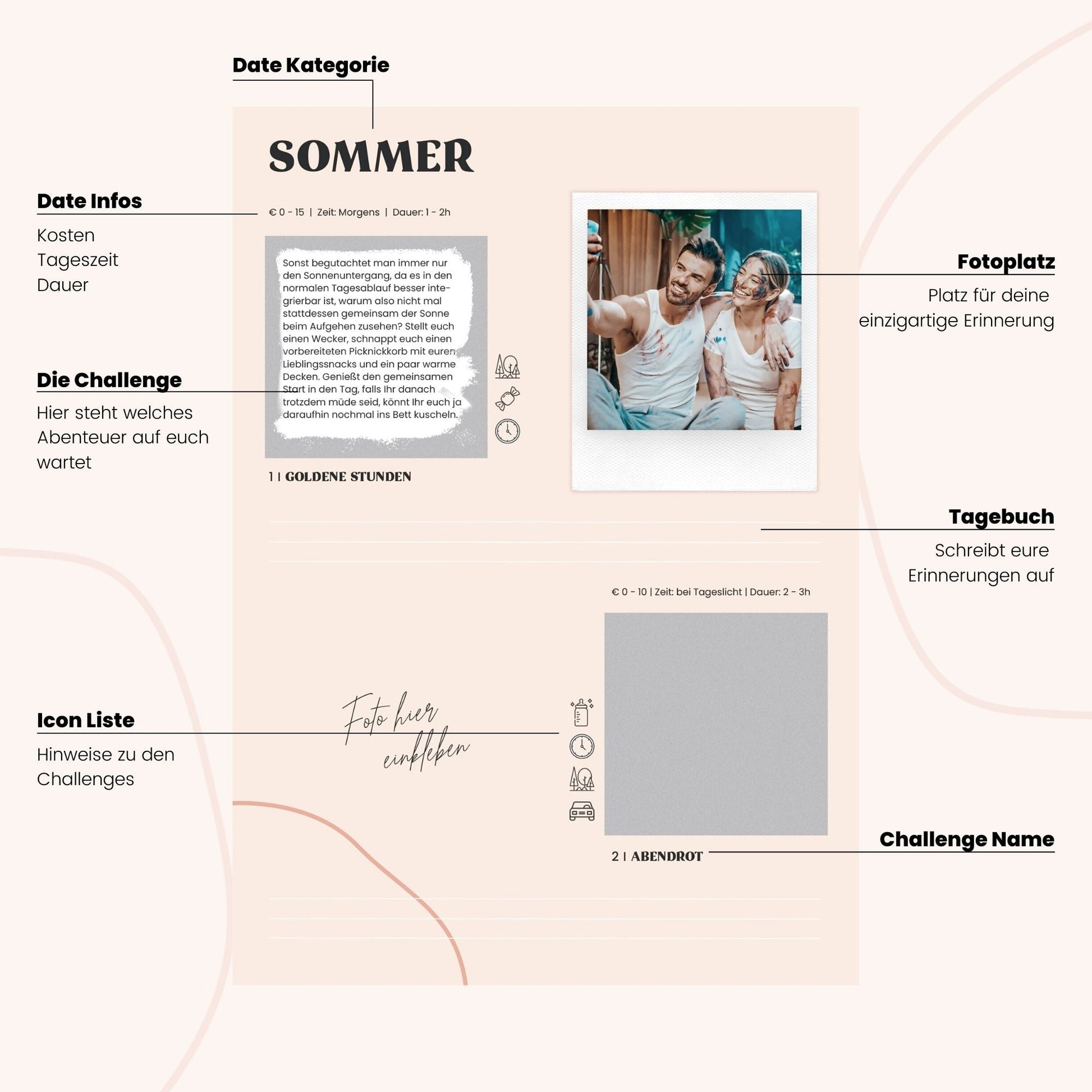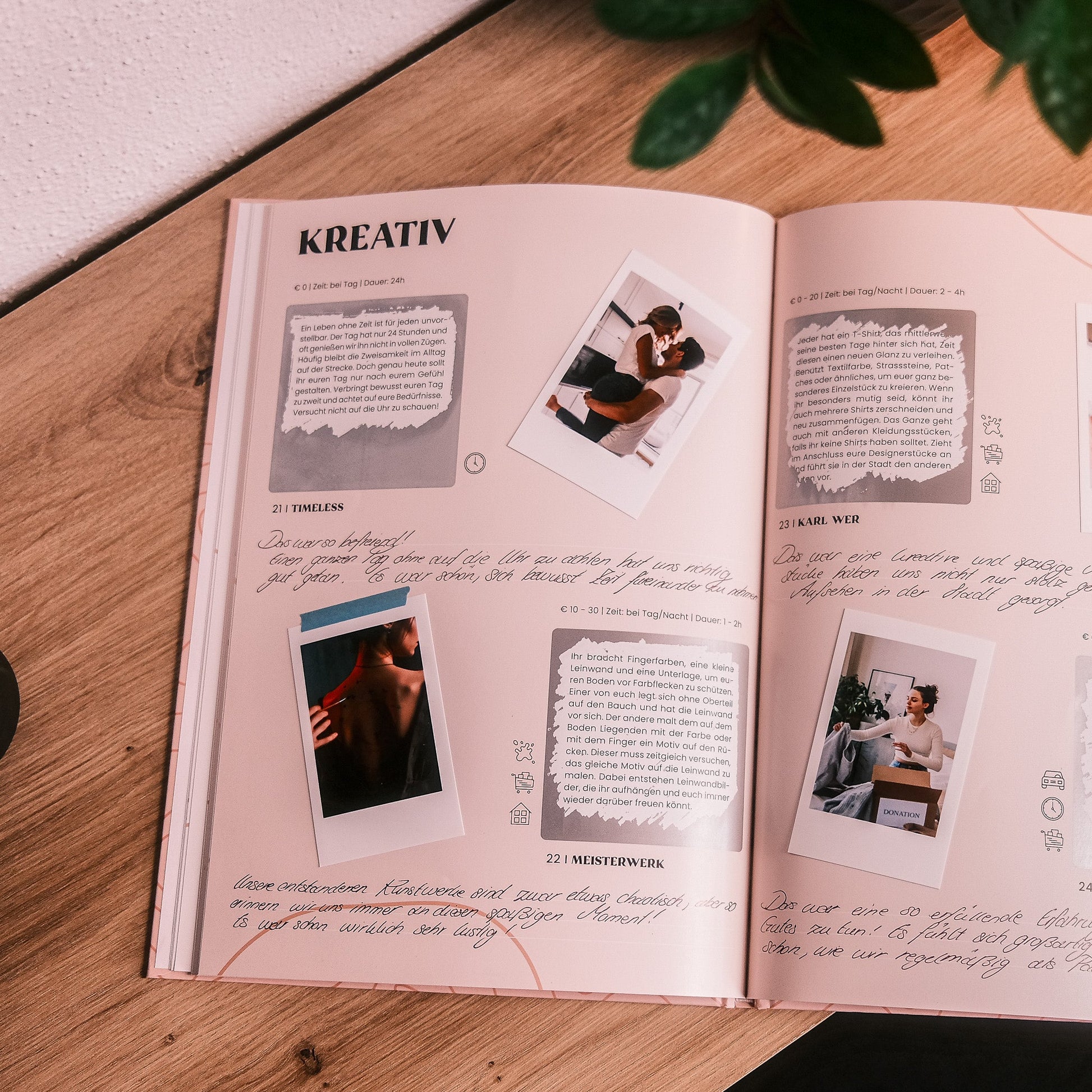 Entdecke das "Memories2Make" Challengebuch für Paare – ein einzigartiges Erlebnisbuch, das eure Beziehung mit 32 aufregenden Date-Ideen aufpeppt. Jedes Date ist hinter einem Rubbelfeld verborgen, das nur darauf wartet, von euch entdeckt zu werden. Die Herausforderungen und Aktivitäten sind darauf ausgelegt, euch aus der Routine zu reißen und neue, gemeinsame Abenteuer und Erinnerungen erleben zu lassen.