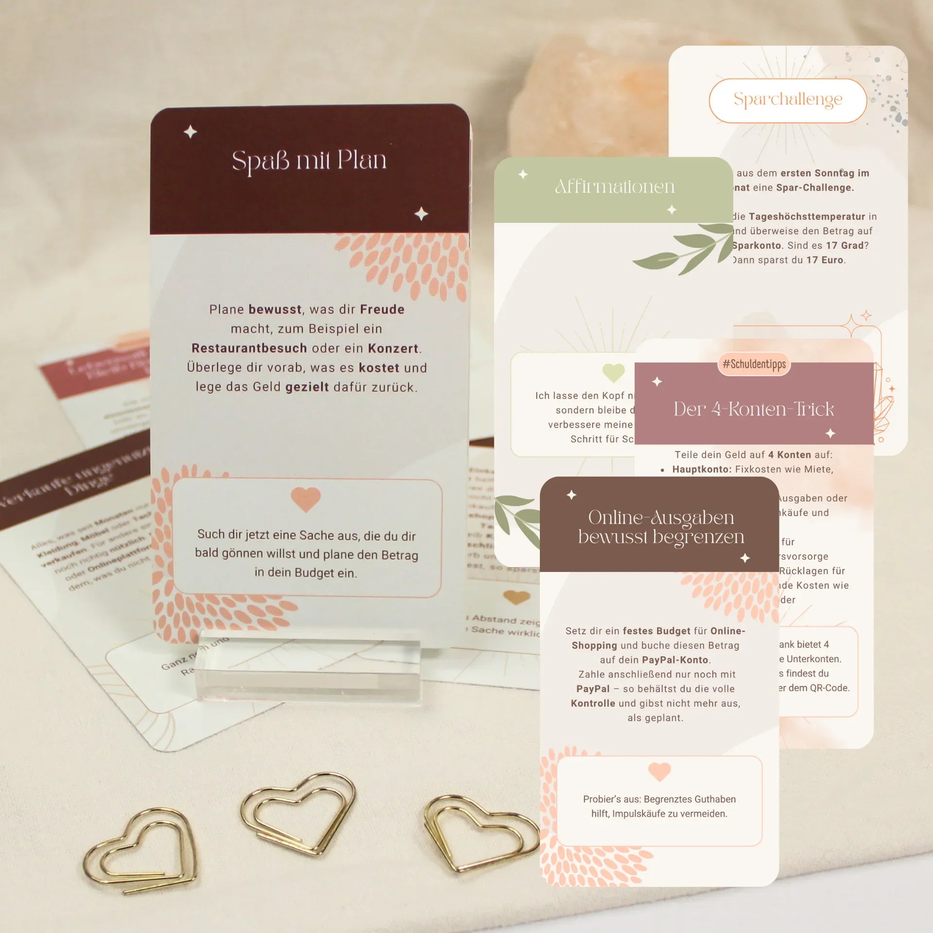 Unsere hochwertigen Finanzkarten helfen dir dabei, dein Geldverhalten zu verändern, Schulden abzubauen, motiviert zu bleiben und aktiv Geld zu sparen. Aufgeteilt in fünf Kategorien bekommst du insgesamt 40 kompakte Impulse rund ums Thema Geld, von praktischen Spartipps und Challenges bis hin zu positiven Afformationen und fundierten Strategien wie dem 4-Konten-Modell. Die Karten kommen im praktischen Format 7x12 cm auf extra dickem 350 g Papier inklusive Aufsteller, sodass du dir jeden Tag neue Motivation sichtbar machen kannst. Mit der beiliegenden Anleitung findest du sofort den Einstieg in dein neues, finanziell achtsames Leben.
