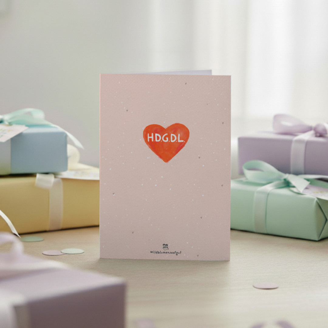 HDGDL - fünf Buchstaben, die von Herzen kommen: Diese Karte ist eine liebevolle Botschaft an die beste Freundin, den Herzensmenschen oder jemanden, der einfach wichtig ist. Ein ehrliches "Ich hab dich ganz doll lieb" - direkt, persönlich und schön wie echte Freundschaft.