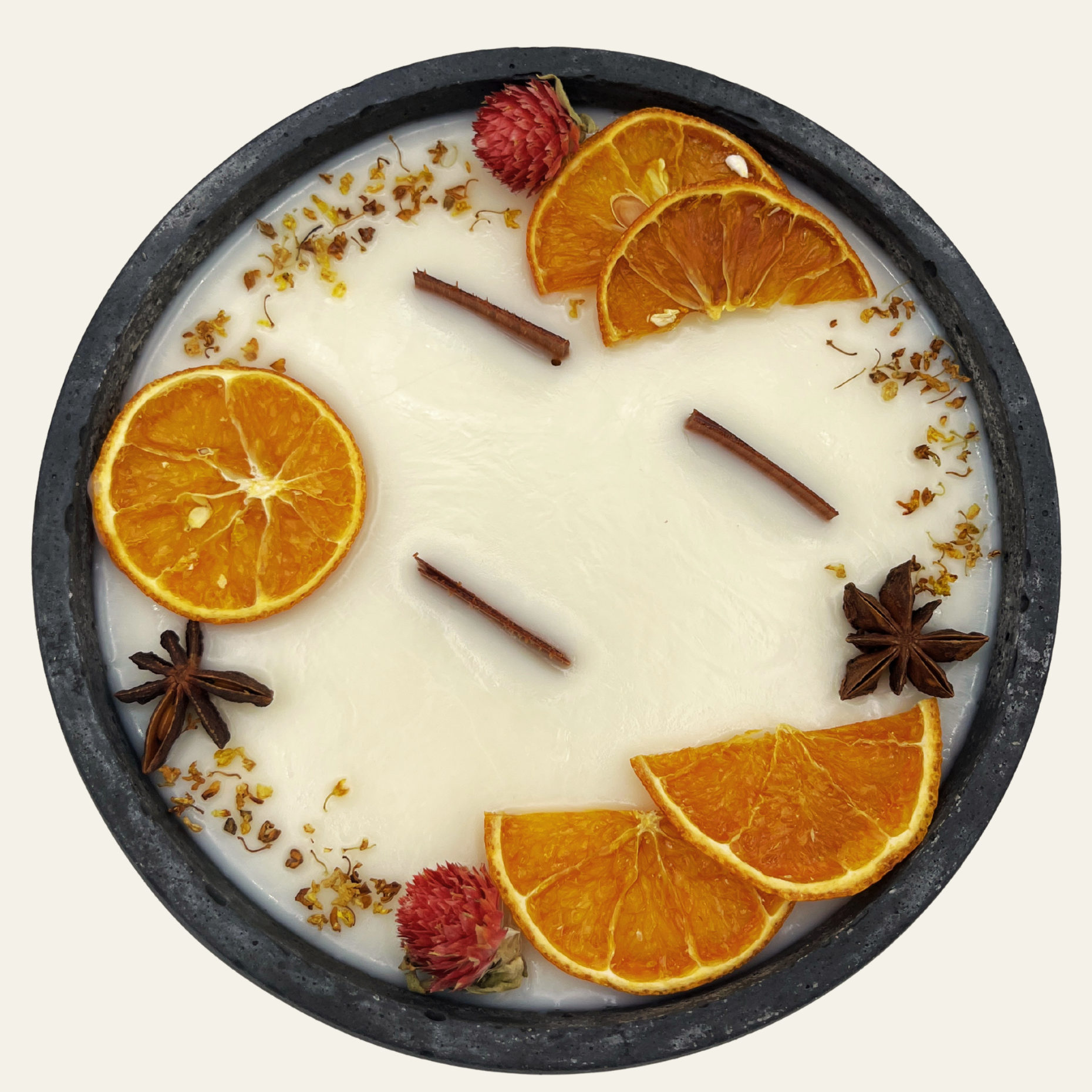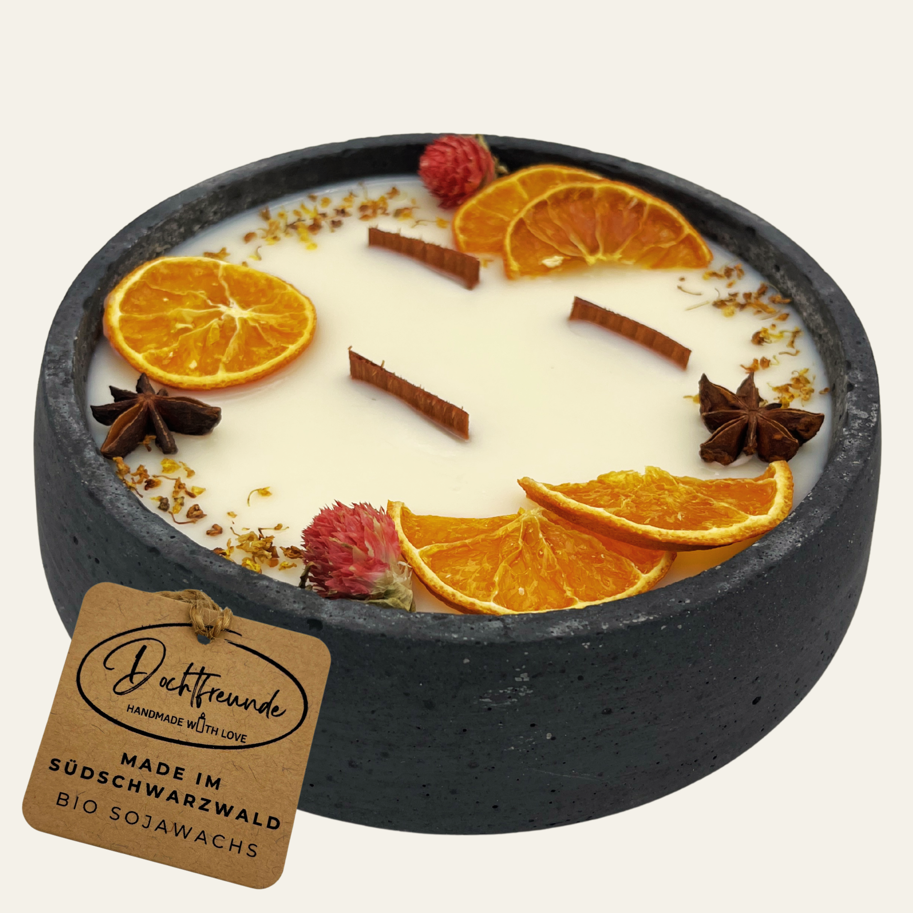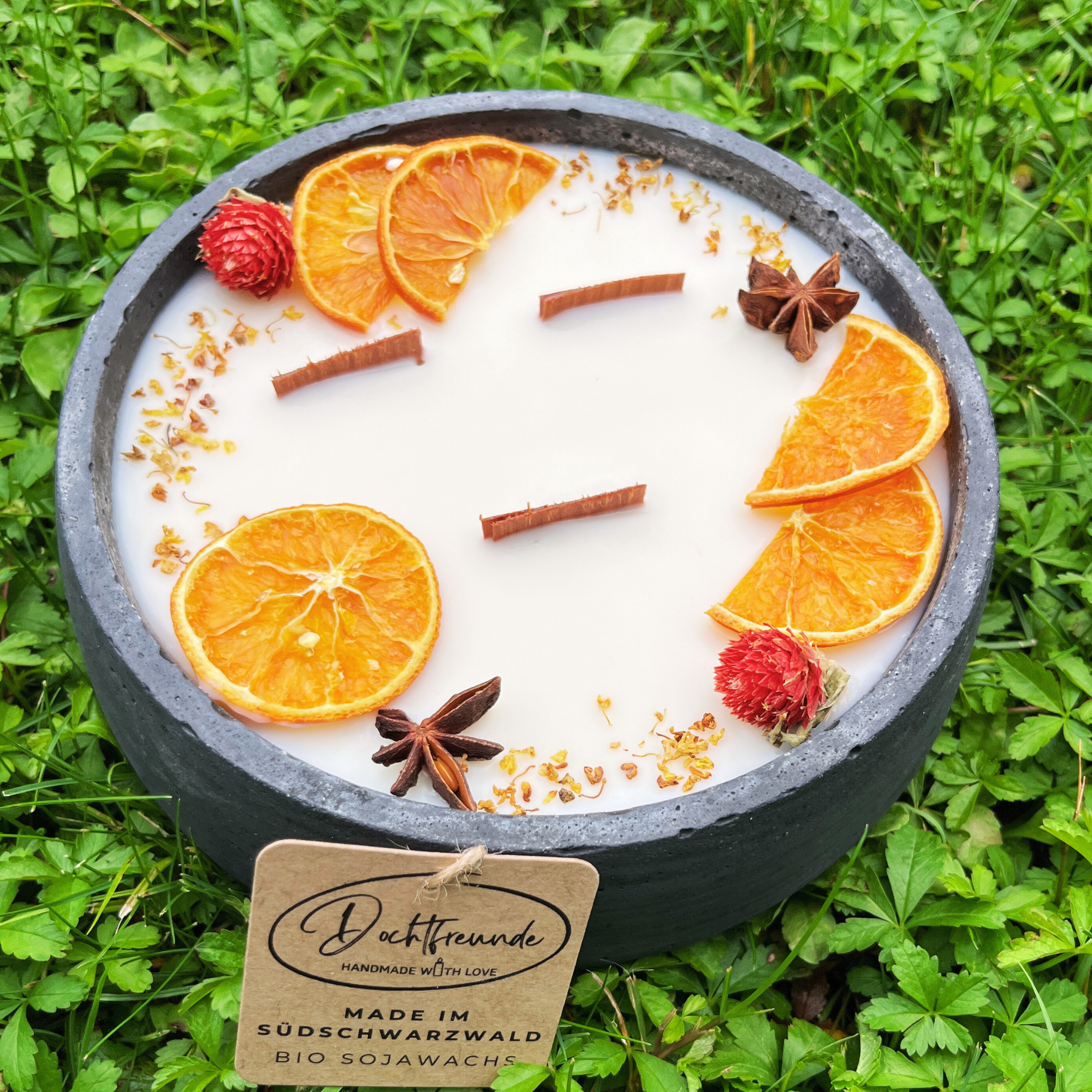 - Material: Veganes Sojawachs, versiegelter Beton, Holzdocht, getrocknete Blüten.