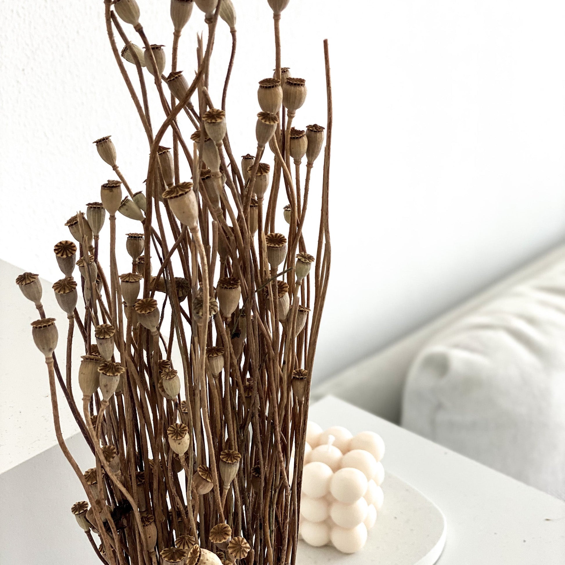 Hol dir das Frühsommer-Feeling mit getrockneten Mohnkapseln nach Hause. Egal ob einzeln oder im Bund, sie sehen dezent, elegant und minimalistisch in einer Vase oder in Trockenblumensträußen aus. Auch super zum Basteln. Sehr lange haltbar: die getrockneten Mohnkapseln halten über mehrere Jahre ihre Form.