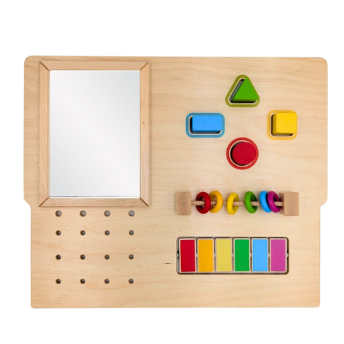 Dank integrierter Elemente wie Spiegel, Ringe, Drehscheiben und beweglichen Wurfteilen lädt die Motorikplatte Kinder zum aktiven Entdecken, Greifen und Experimentieren ein. Jedes Detail wurde hochwertig verarbeitet und kindgerecht gestaltet – für sicheres, selbstständiges Spielen.