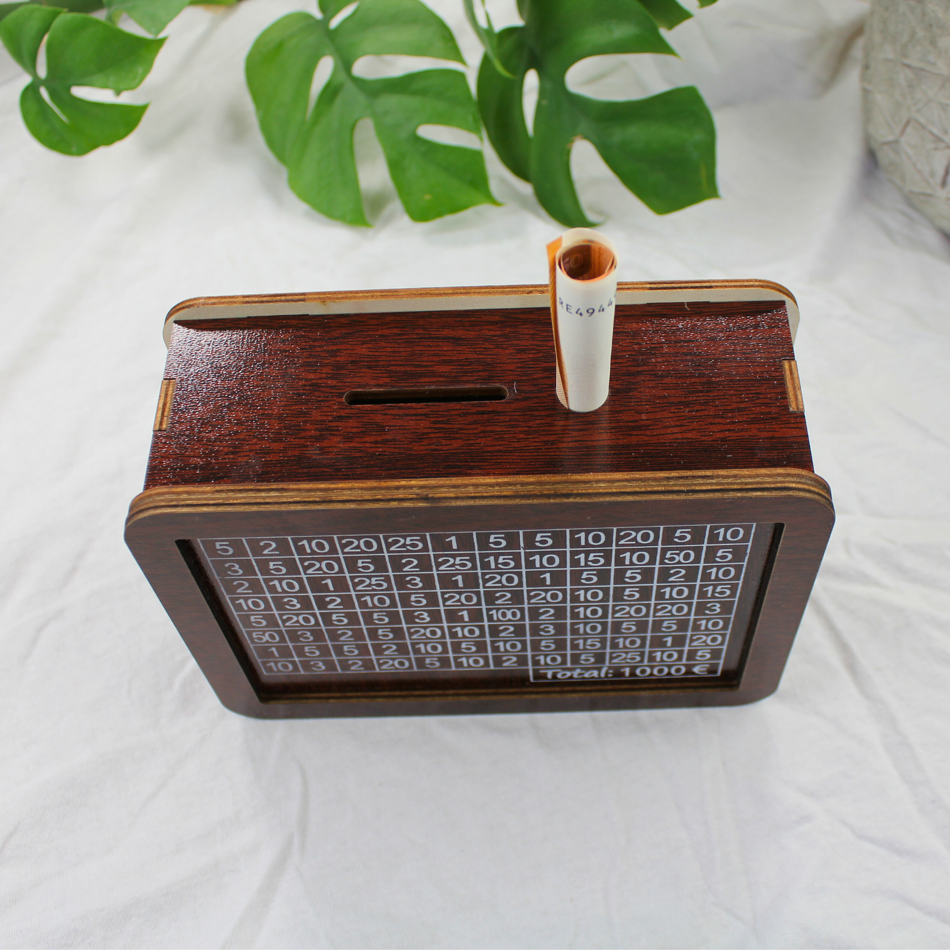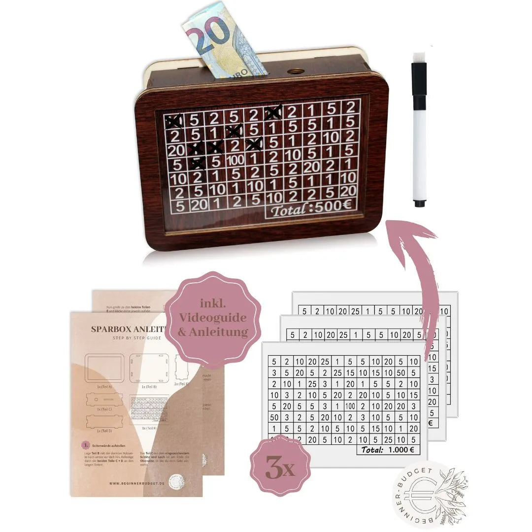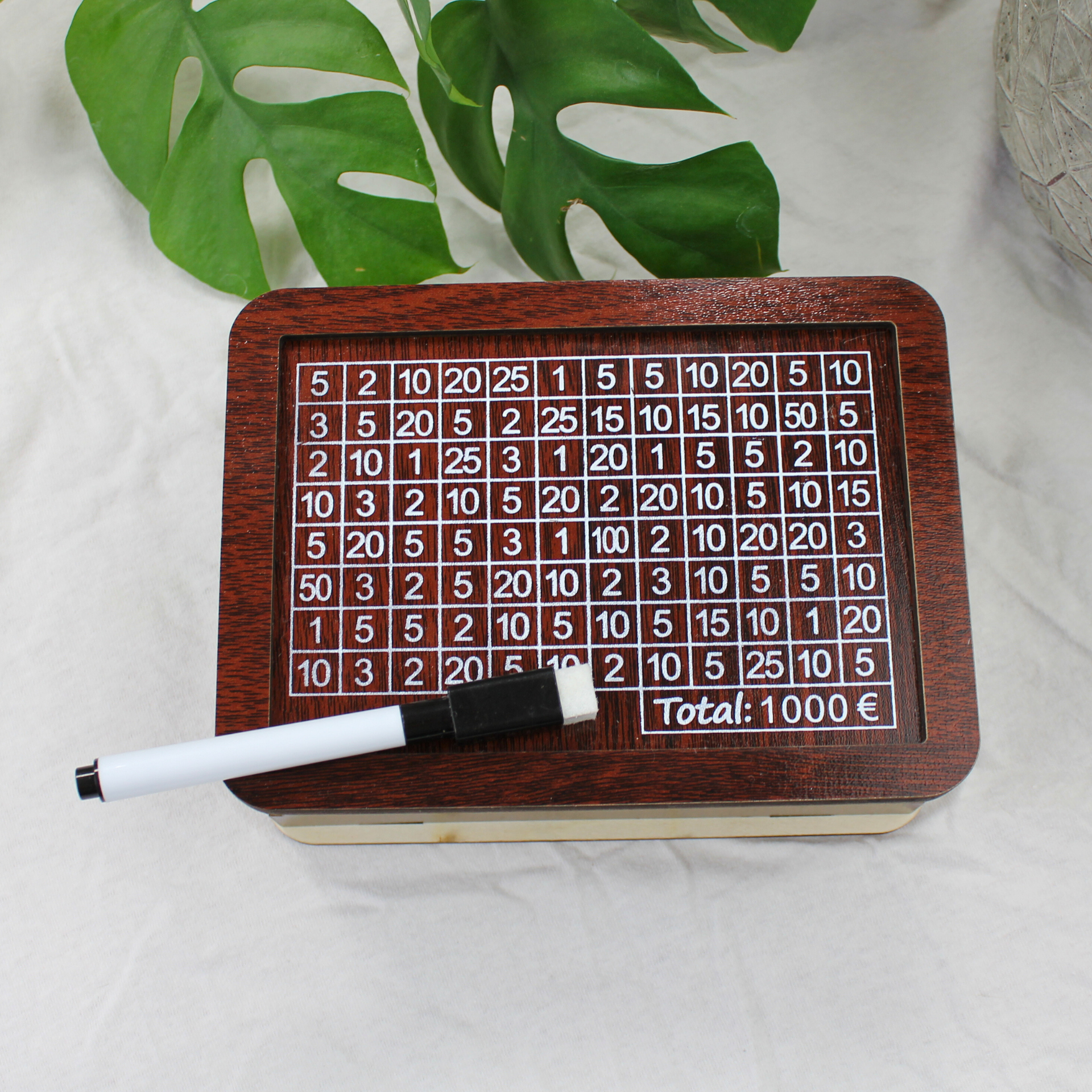 Jedes mal wenn du etwas Geld übrig hast oder Wechselgeld bekommst hast, streichst du den Betrag auf der Vorderseite der Sparbox durch, bis du 1.000€ angepart hast.