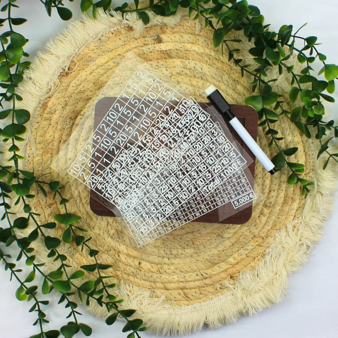 Mit dem abwischbaren Stift (Whiteboard-Marker) kannst du nach Erreichen deines Ziel einfach die Kreuze mit dem integrierten Schwamm abwischen. Schon kannst du dein neues Sparziel anvisieren.